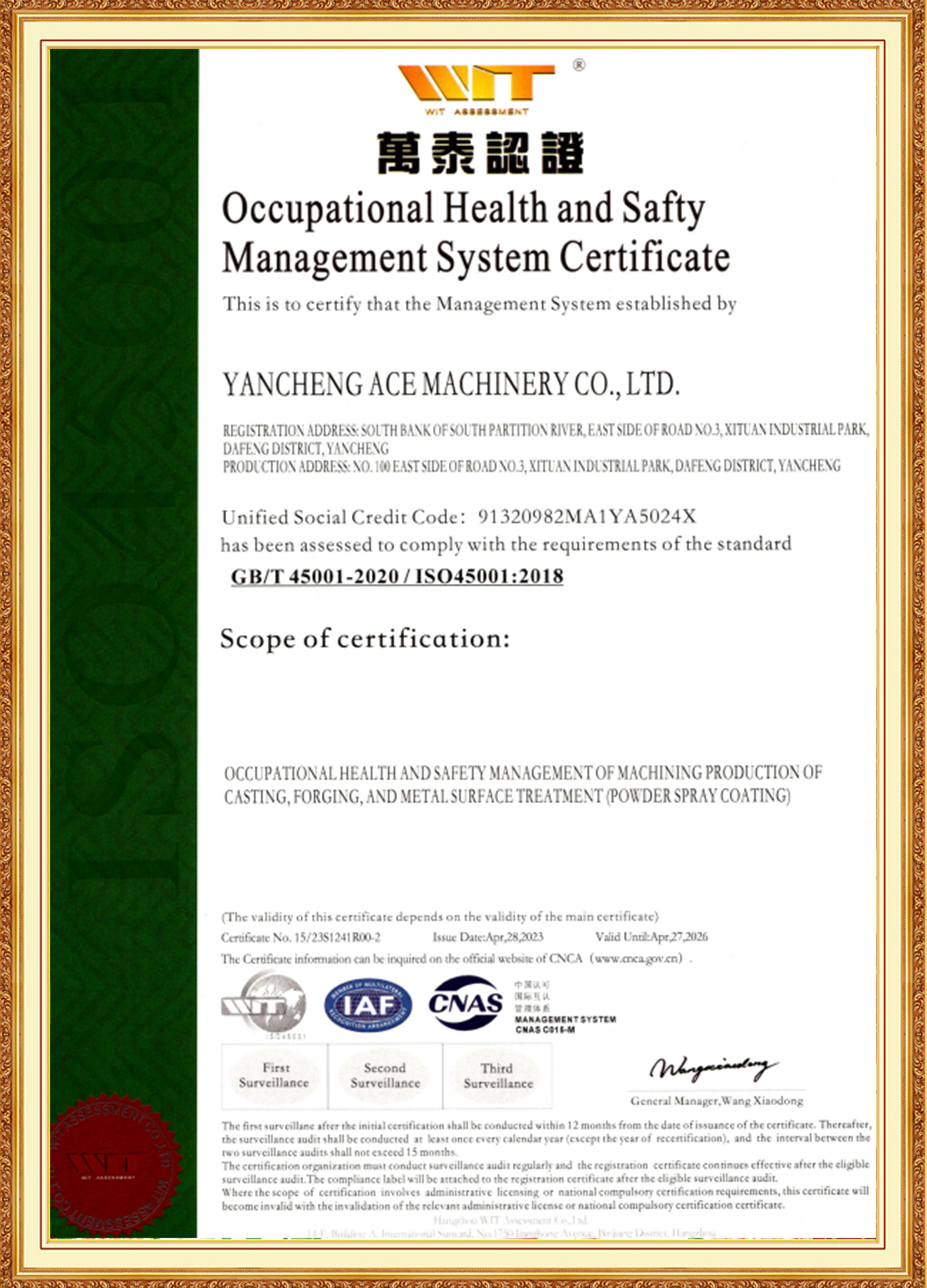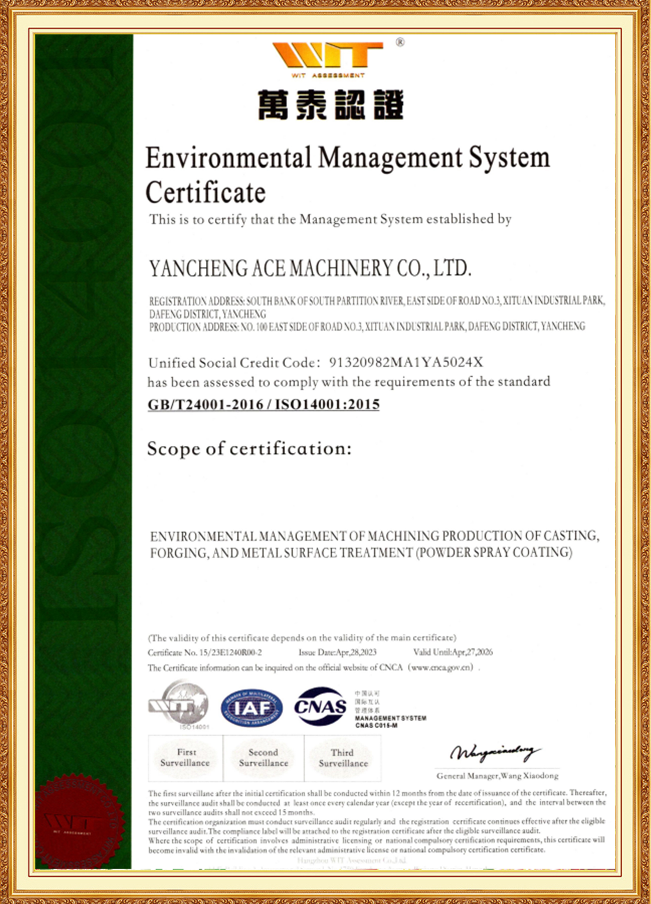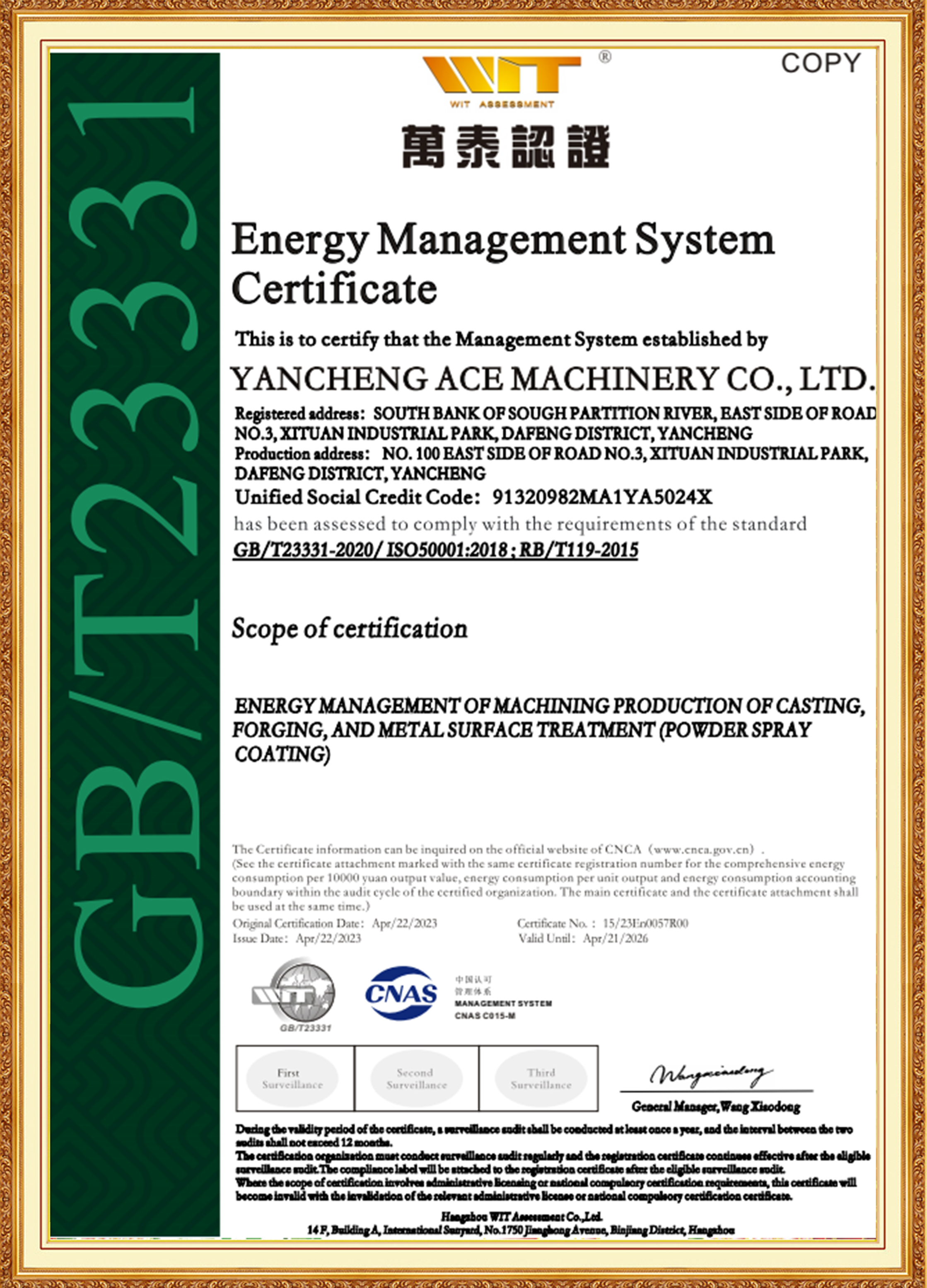 Grupul ACE este susținută de o echipă de management formată din tineri membri cheie, cu experiență în industria materialelor, tratamentului termic, prelucrarea mecanică și tratarea suprafețelor. Sunt bine versați în standardele internaționale și interne, sunt de pionierat și sunt dedicați inovației. Filiala ACE Machinery a trecut de certificarea TÜV Rheinland ISO 9001 pentru Sistemul de Management al Calității, precum și certificările de sistem ISO 14001, 45001 și 50001. Este recunoscută ca o întreprindere specializată, rafinată, unică și inovatoare, o întreprindere națională de înaltă tehnologie și deține un rating de credit al întreprinderii de nivel 3A.